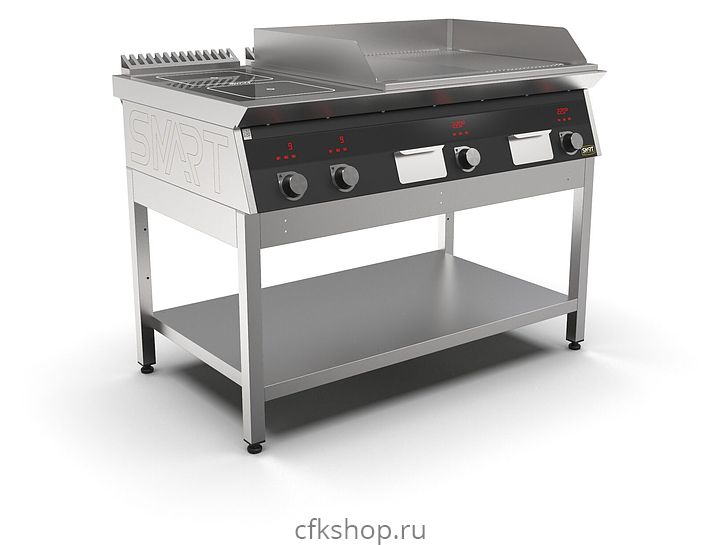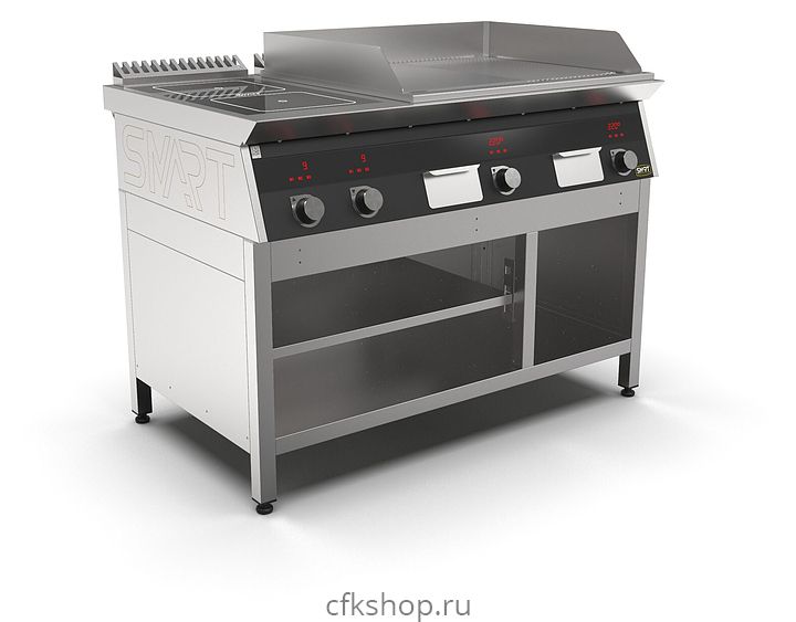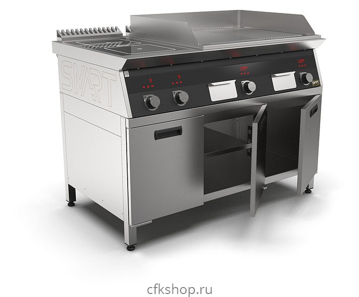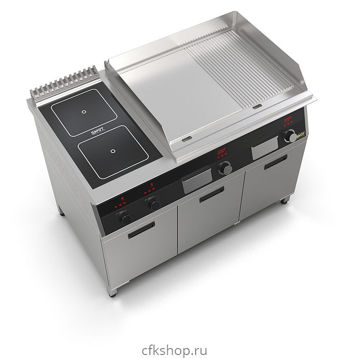 Комбинированная индукционная плита SMART INDUCTION K96-3KPRB предназначена для приготовления и быстрого разогрева блюд на предприятиях общественного питания и торговли. Модель оснащена электронно-механической панелью управления с цифровой индикацией и сенсорными кнопками, 3 съемными жировыми фильтрами для отделения жира и влаги от поступающего внутрь аппарата воздуха, 2 ящиками для сбора жира и регулируемыми по высоте ножками. Корпус и столешница выполнены из нержавеющей стали AISI430, рабочая поверхность плиты - из стеклокерамики, рабочая поверхность гриля - из нержавеющей стали, передняя панель имеет стойкое полимерное покрытие черного цвета.
