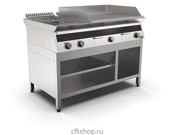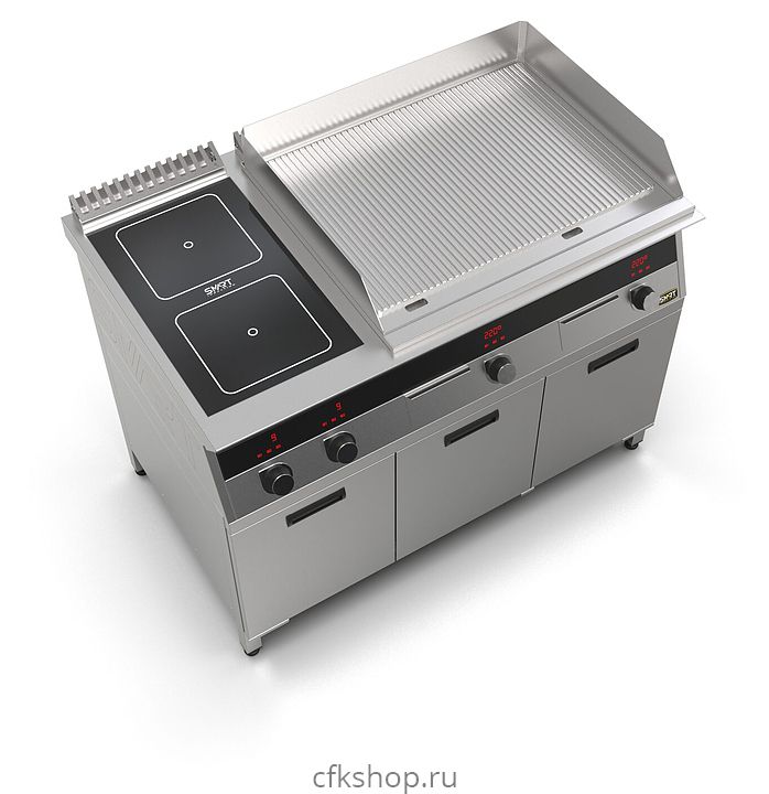 Комбинированная индукционная плита SMART INDUCTION K96-3KRRN предназначена для приготовления и быстрого разогрева блюд на предприятиях общественного питания и торговли. Модель оснащена электронно-механической панелью управления с цифровой индикацией и сенсорными кнопками, 3 съемными жировыми фильтрами для отделения жира и влаги от поступающего внутрь аппарата воздуха, 2 ящиками для сбора жира и регулируемыми по высоте ножками. Корпус и столешница выполнены из нержавеющей стали AISI430, рабочая поверхность плиты - из стеклокерамики, рабочая поверхность гриля и передняя панель - из нержавеющей стали.