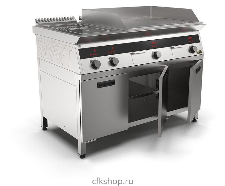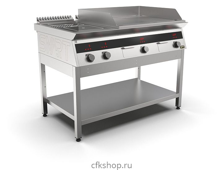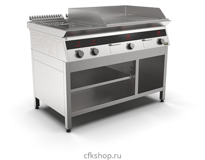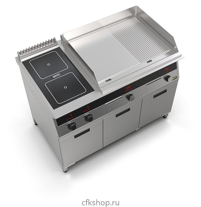 Комбинированная индукционная плита SMART INDUCTION K96-5KPRN предназначена для приготовления и быстрого разогрева блюд на предприятиях общественного питания и торговли. Модель оснащена электронно-механической панелью управления с цифровой индикацией и сенсорными кнопками, 3 съемными жировыми фильтрами для отделения жира и влаги от поступающего внутрь аппарата воздуха, 2 ящиками для сбора жира и регулируемыми по высоте ножками. Корпус и столешница выполнены из нержавеющей стали AISI430, рабочая поверхность плиты - из стеклокерамики, рабочая поверхность гриля и передняя панель - из нержавеющей стали.