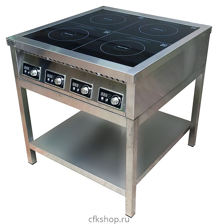 Индукционная плита ЦМИ ПИ-4(3х5) предназначена для приготовления различных блюд в наплитной посуде на предприятиях общественного питания и торговли. Нагрев рабочей поверхности осуществляется моментально, вследствие чего затрачивается меньшее количество электроэнергии. Корпус, каркас подставки и полка выполнены из нержавеющей стали AISI 430 толщиной 0,8 мм, верхний контур - из нержавеющей стали AISI 430 толщиной 1,5 мм, ножки - из нержавеющей трубы 40х40х1,2 мм, конфорка - из жаропрочного стекла толщиной 5 мм.