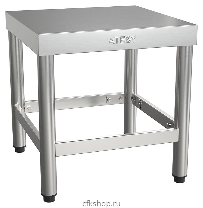 Подставка ATESY ПКИ-П-950.500.420-02 серии Престиж используется на предприятиях общественного питания и торговли для установки различного кухонного оборудования и инвентаря. Столешница и обвязка выполнены из нержавеющей стали AISI 430 толщиной 0,8 мм, ножки - из круглой трубы 40х40 мм из нержавеющей стали AISI 201.