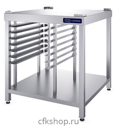 Подставка KAYMAN ПО-191/0808-09-А используется для установки пароконвектомата на предприятиях общественного питания и торговли. Модель оснащена столешницей, полкой, направляющими, регулируемыми по высоте опорами и в верхней части столешницы по углам установлены упоры. Разборный каркас выполнен из трубы 40х40 мм нержавеющей стали AISI 304, стоики - из стали AISI 210.