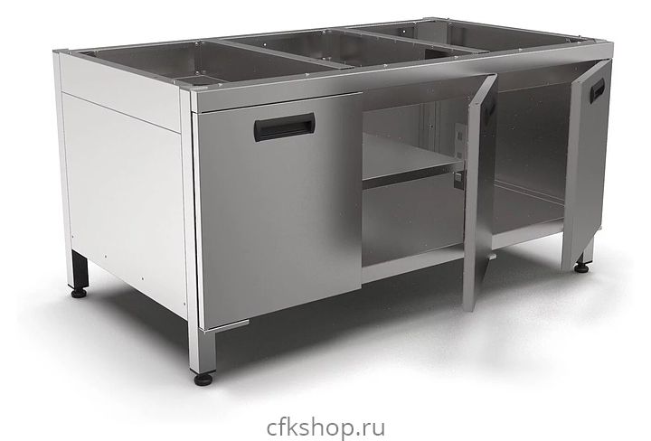 Подставка SMART INDUCTION D76 используется совместно с индукционными плитами C76, грилями G76 и комбинированными индукционными плитами K76 на предприятиях общественного питания и торговли. Модель оснащена 2 полками, 3 распашными дверьми и регулируемыми по высоте ножками, что позволяет компенсировать неровности пола. Каркас и полка выполнены из нержавеющей стали AISI 430, ножки - из нержавеющей трубы квадратного сечения 40x40 мм.