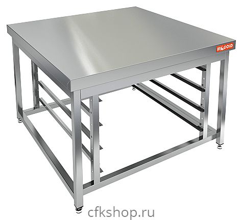 Подставка HICOLD НППК-9/9/6 из нержавеющей стали AISI 430 оснащена направляющими для противней, используется как вспомогательное оборудование под пароконвектомат на профессиональных кухнях.