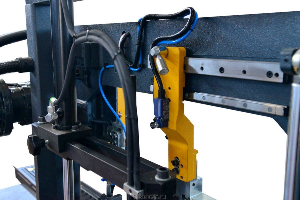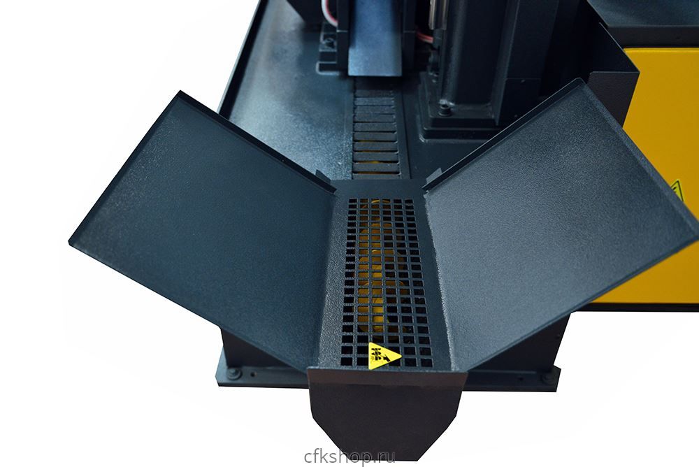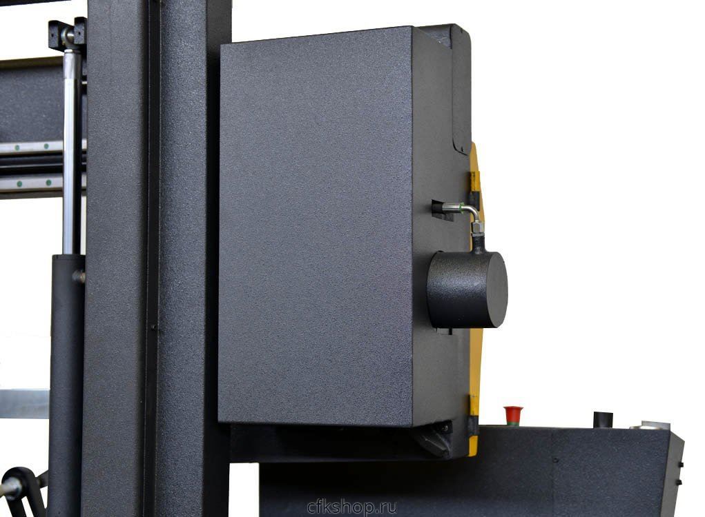 Максимальное сечение заготовки 450х330 мм. Мощные вертикальные направляющие, регулируемые в зависимости от ширины заготовки с блоком подшипников и твердосплавных пластин позволяют избежать отклонения полотна при резке сплошных материалов.