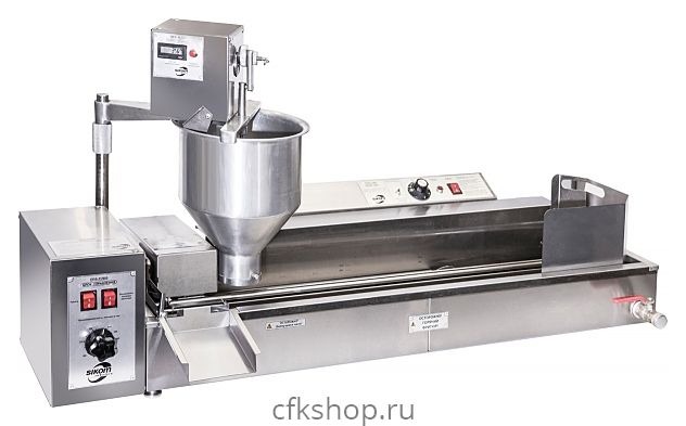 Пончиковый аппарат Sikom ПРФ-11/900 (D30) используется на предприятиях общественного питания и торговли. Оборудование в автоматическом режиме формует тестовую заготовку, отсаживает ее во фритюрную ванну, обжаривает по очереди с 2 сторон и выгружает из ванны готовый пончик. Модель электромеханической панелью управления, делителем-дозатором и плунжерной парой 30 мм. Корпус выполнен из высококачественной нержавеющей стали, делитель-дозатор из пищевого алюминиевого сплава.