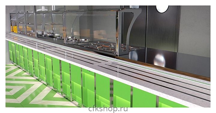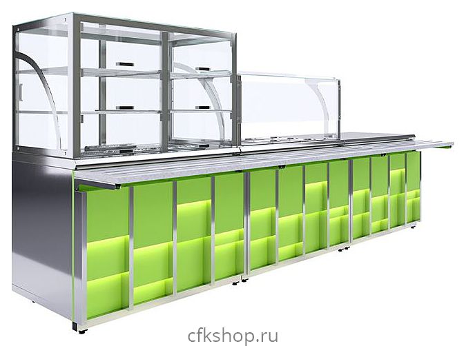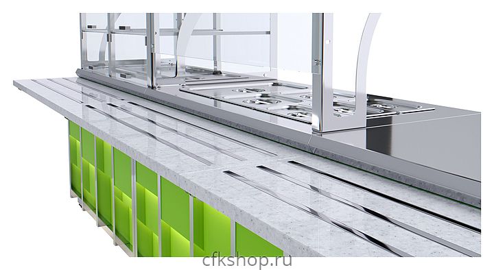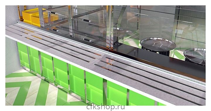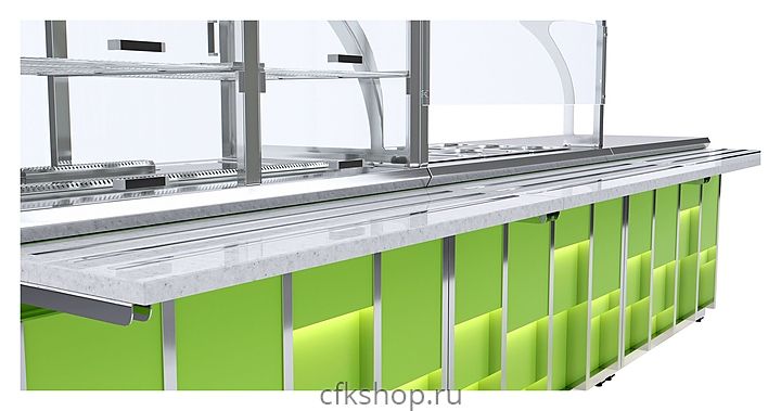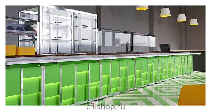Холодильный прилавок Luxstahl ПХК (С)-1200 Premium Neon используется в составе линии раздачи Neon на предприятиях общественного питания и торговли для кратковременного хранения, демонстрации и раздачи холодных напитков, салатов, кисломолочных продуктов и других блюд, требующих хранения в охлажденном состоянии. Модель оснащена 4 хромированными подвесными полками-решетками, подсветкой и дверцами из прочного прозрачного поликарбоната. Каркас выполнен из нержавеющей стали AISI 430 толщиной 1 мм, стенки верхней части витрины - из закаленного стекла толщиной 6 мм, фасад - из ЛДСП, стойки фасада - из ДСП и HPL-пластика Abet Laminati, направляющая для подносов - из профильной трубы 25х25 мм.
