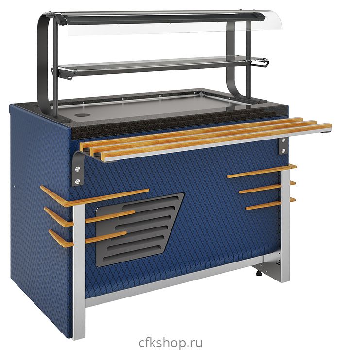 - Вместительная полка в верхней части с запатентованной системой регулировки (для выкладки неохлаждаемых блюд и напитков)