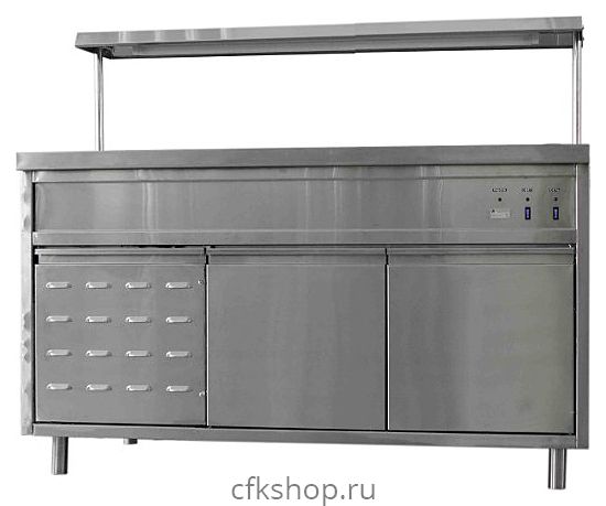 Холодильный прилавок Тулаторгтехника ПВ(Н)О-1(2) используется в составе линий раздач на предприятиях общественного питания и торговли для демонстрации, кратковременного хранения и охлаждения напитков и различных блюд. Модель оснащена полкой с подсветкой, нейтральным шкафом с дверками и регулируемыми по высоте опорами, что позволяет компенсировать неровности пола. Изделие выполнено из пищевой нержавеющей стали.
