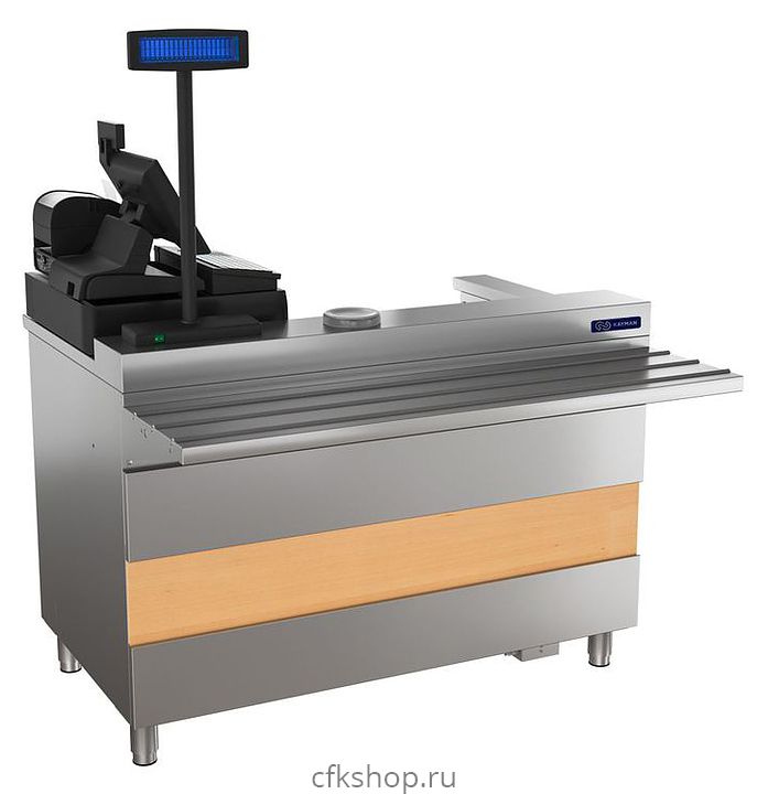 Кассовый прилавок KAYMAN ПК-1200-02 используется в составе линии раздачи PRESTO на предприятиях общественного питания и торговли для оборудования рабочего места продавца-кассира. Модель оснащена розеткой для подключения кассового аппарата, направляющей для подносов и регулируемыми по высоте опорами. Корпус, столешница и направляющая для подносов выполнены из нержавеющей стали AISI 430, столешница усилена листом ЛДСП, ножки - из нержавеющей стали, опоры ножек - из пластика.