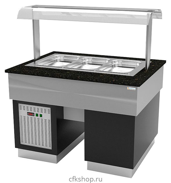Холодильный прилавок Gastrolux ПО-2010/5GN/SI линии раздачи Stone Island предназначен для демонстрации, охлаждения и поддержания в прохладном состоянии различных блюд на предприятиях общественного питания с организацией питания по принципу "шведский стол". Оборудование оснащено тумбой для хранения.