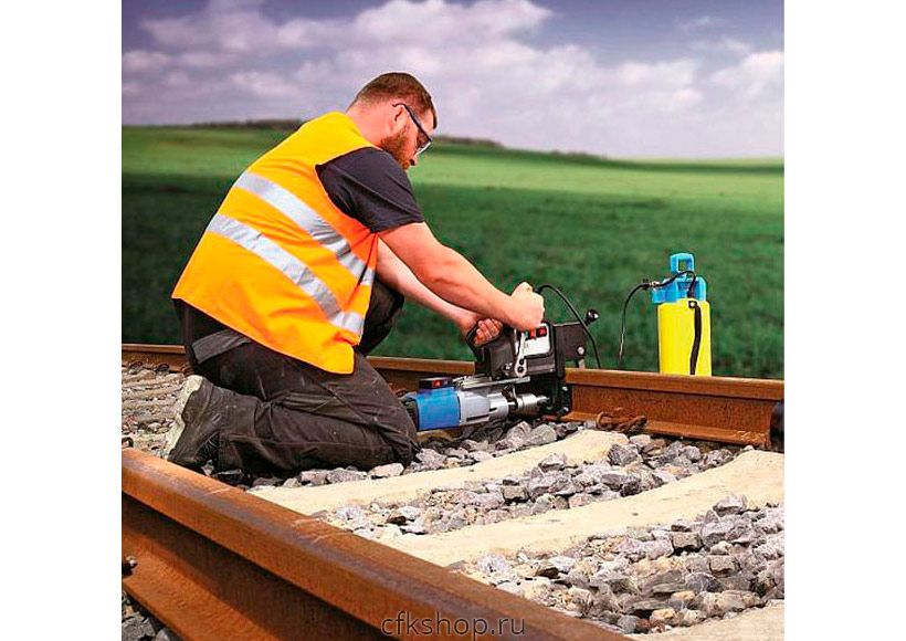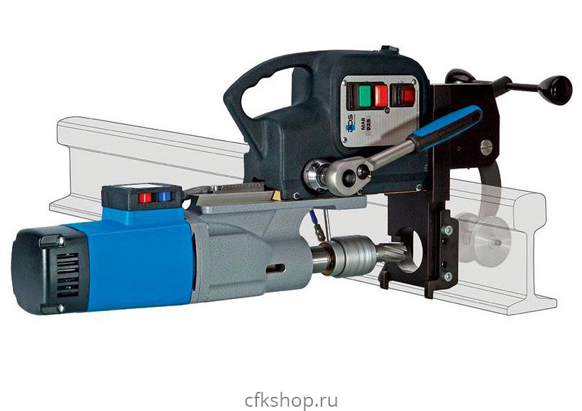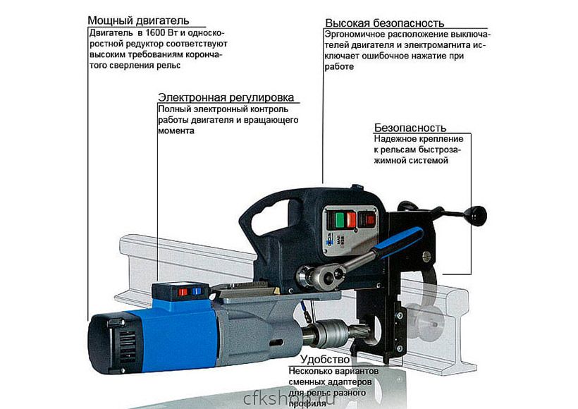 Сам процесс сверления осуществляется после надежной фиксации станка. Быстрозажимная система обеспечивает надежное крепление прибора к рельсам, что дает высокую точность при работе. Эргономичное расположение кнопок выключения двигателя, электромагнита полностью исключает ошибочное их нажатие. Рельсовый переходник позволяет применять станок на любых железнодорожных полотнах. В комплекте присутствуют несколько корончатых сверл различного диаметра – это позволяет создавать различные отверстия. Кроме удобства работы, станок RaiLMAB 925 обеспечивает безопасность, так как характеризуется закрытой проводкой.