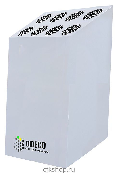 Бактерицидный рециркулятор DIDECO МАКС ХОЛЛ 1200 используется на предприятиях общественного питания и торговли, в офисах, образовательных и медицинских учреждениях, а также в других местах общественного пользования для обеззараживания воздуха в помещениях. Модель работает на 8 бактерицидных лампах, производящих ультрафиолетовое излучение, которое губительно влияет на практически все известные вирусы, болезнетворные бактерии и грибы. Корпус выполнен из металла с порошковым окрашиванием.