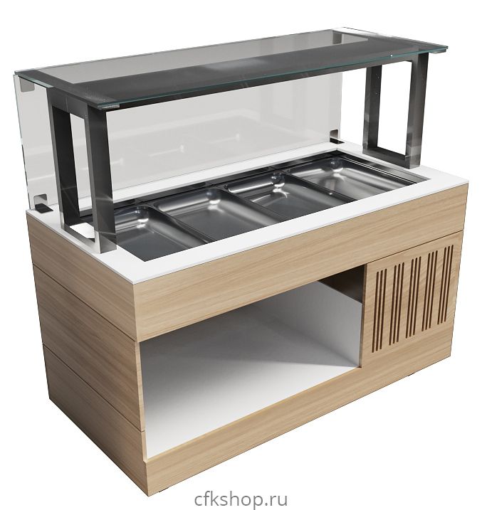 Холодильный салат-бар Astropit СБХСН41-001 предназначен для кратковременного хранения и демонстрации салатов и других готовых блюд в составе линий раздач на предприятиях общественного питания. Модель оснащена тумбой с нишей, LED-подсветкой, фронтальным экраном, колесами, 2 из которых с тормозами и смещенной полкой в основании ниши для хранения инвентаря. Тумба оклеена пластиком и выполнена из МДФ со скрытым крепежом и белого камня.