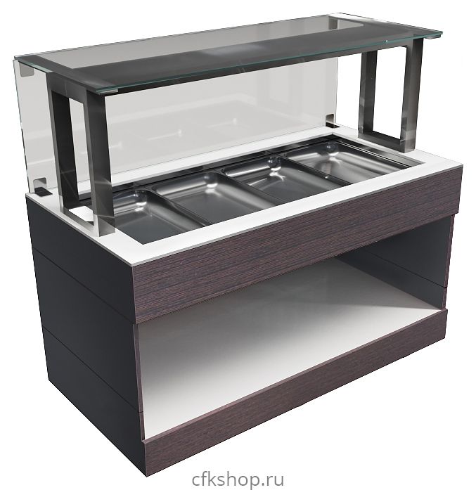 Тепловой салат-бар Astropit СБТСН41-002 предназначен для демонстрации, подогрева и поддержания постоянной температуры готовых блюд в составе линий раздач на предприятиях общественного питания. Модель оснащена тумбой с нишей, LED-подсветкой, фронтальным экраном, колесами, 2 из которых с тормозами и смещенной полкой в основании ниши для хранения инвентаря. Тумба оклеена пластиком и выполнена из МДФ со скрытым крепежом и белого камня.