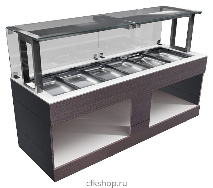 Тепловой салат-бар Astropit СБТСН61-002 предназначен для демонстрации, подогрева и поддержания постоянной температуры готовых блюд в составе линий раздач на предприятиях общественного питания. Модель оснащена тумбой с нишей, LED-подсветкой, фронтальным экраном, колесами, 2 из которых с тормозами и смещенной полкой в основании ниши для хранения инвентаря. Тумба оклеена пластиком и выполнена из МДФ со скрытым крепежом и белого камня.