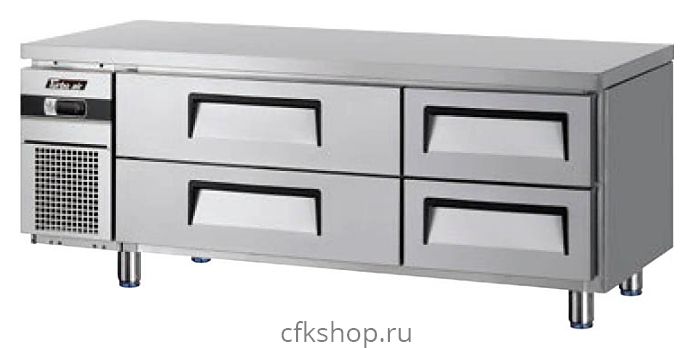 Шеф-база Turbo air KUC15-4 состоит из рабочей поверхности, на которой можно раскатывать тесто и обрабатывать ингредиенты для приготовления блюд, и камеры, предназначенной для охлаждения и кратковременного хранения скоропортящихся продуктов и напитков на предприятиях пищевой промышленности, общественного питания и торговли. Модель оснащена полиуретановой теплоизоляцией высокой плотности и увеличенной, более сбалансированной (CFC free) системой охлаждения. Столешница шеф-базы изготовлена из цельного куска нержавеющей стали, корпус и ящики также из нержавеющей стали.
