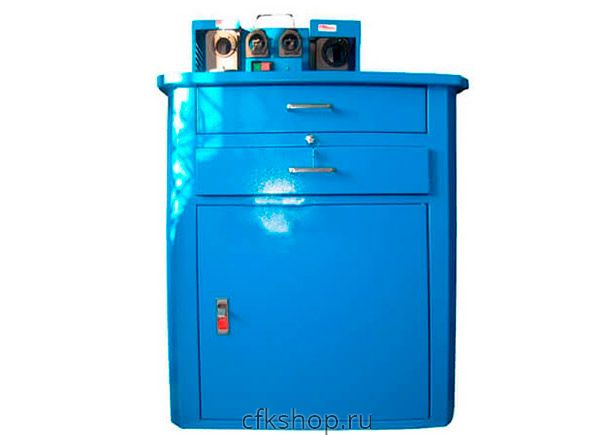 Металлический передвижной шкаф используется как для хранения инструмента, так и как подставка под заточной станок. Имеются удобные отделения с местами для хранения цанг, втулок, зажимных гаек и другого инструмента (закрывается на ключ). Возможность установки промышленного пылесоса для вытяжки обработанных частиц.
