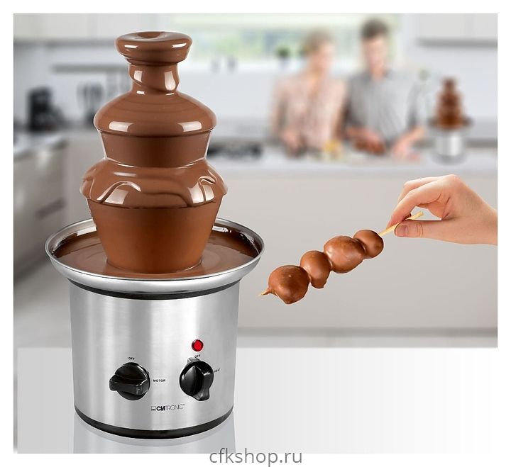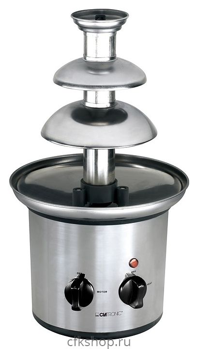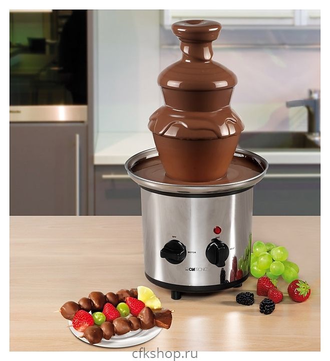 Шоколадный фонтан Clatronic SKB 3248 используется на предприятиях общественного питания и торговли, а также в домашних условиях для нагревания шоколада и последующего поддержания заданной температуры с эффектной демонстрацией процесса каскадного стекания растаявшего продукта. Модель оснащена электромеханической панелью управления. Корпус, каскадная башня и поддон выполнены из нержавеющей стали.