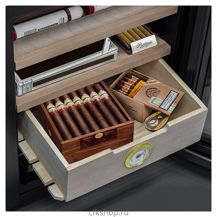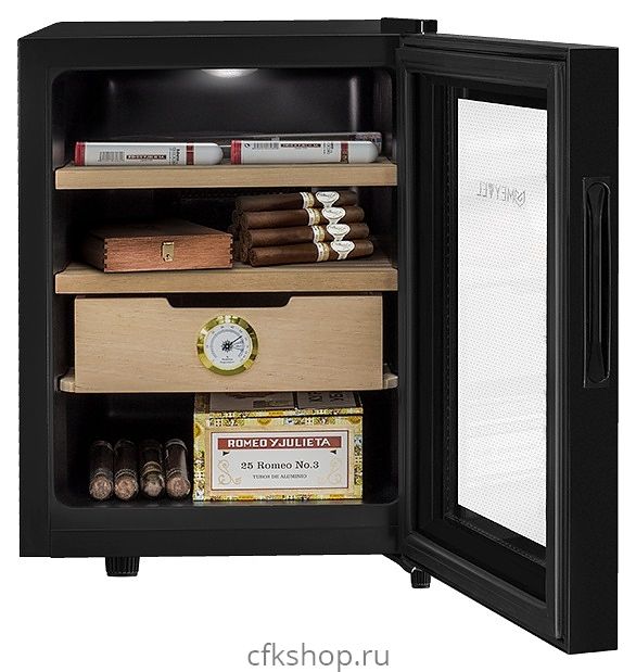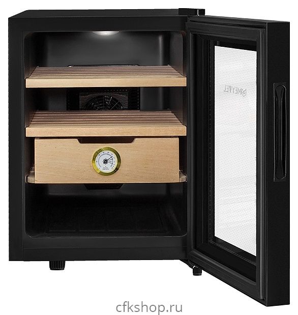 Сигарный шкаф MEYVEL MC-33BT предназначен для хранения в оптимальных условиях и демонстрации табачных изделий в специализированных магазинах, гостиницах, складских помещениях, а также домашних условиях. Модель оснащена распашной дверью на внешних петлях и сенсорной панелью управления с цифровым дисплеем. Копрус выполнен из стали с антикоррозийным покрытием черного цвета, рама двери – из черного пластика, полки и ящик – из массива древесины испанского кедра.