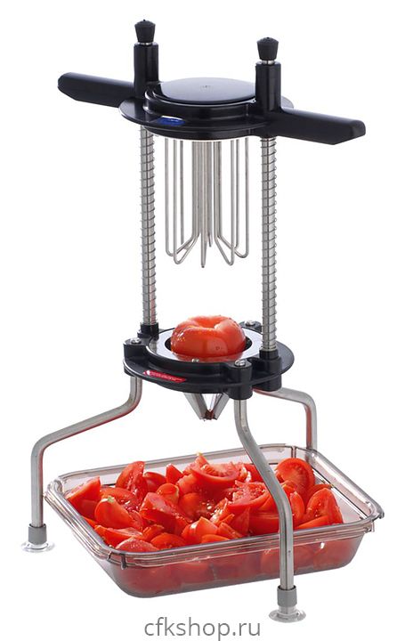 Слайсер Tellier CAX108 предназначен для нарезки томатов, цитрусовых и других овощей и фруктов без косточек на равные дольки на предприятиях общественного питания и торговли. Модель оснащена ножками-присосками. Корпус и нож выполнены из нержавеющей стали, толкатель - из АБС-пластика.