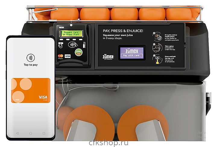 Cоковыжималка Zumex Versatile Pro Cashless предназначена для приготовления натурального сока из различных видов цитрусовых на предприятиях общественного питания и торговли. Модель оснащена системой бесконтактной оплаты, программатором, счетчиком фруктов, сенсорной панелью управления с цифровым дисплеем и 2 встроенными баками для отходов.