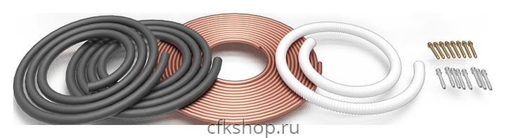 В комплект поставки входит выносной пульт управления, 5 метров межблочного кабеля, 5 метров медной трубки, крепеж для холодильных камер и бетонных поверхностей (анкер), 5 метров утеплителя трубопровода и 1,5 метра дренажный шланг.
