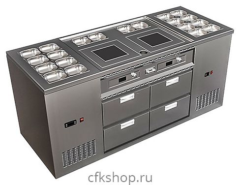 - 2 охлаждаемые ванны вместимостью 8 емкостей GN 1/6 глубиной 150 мм каждая