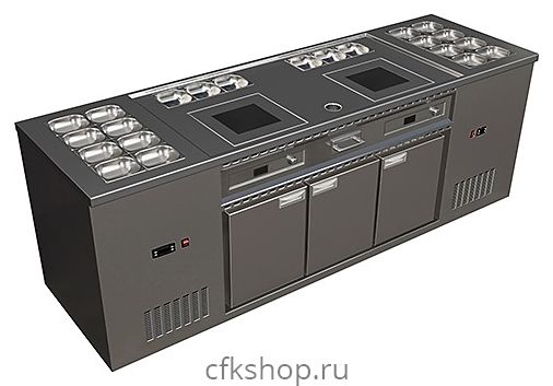 - 2 охлаждаемые ванны вместимостью 8 емкостей GN 1/6 глубиной 150 мм каждая