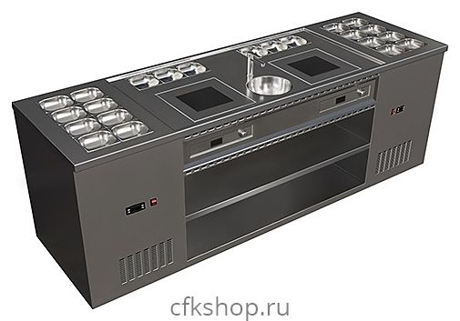 - 2 охлаждаемые ванны вместимостью 8 емкостей GN 1/6 глубиной 150 мм каждая