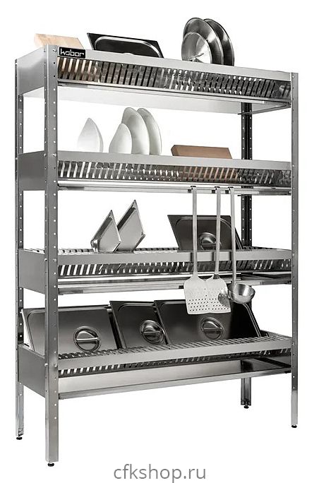 Стеллаж Кобор СКС-120/30/430 предназначен для хранения и сушки тарелок на предприятиях общественного питания, торговли и в промышленно-производственных помещениях. Каркас выполнен в виде уголка 40х40 мм из нержавеющей стали, полки - из нержавеющей стали AISI 430. Уникальная система крепления полок обеспечивает жёсткость конструкции стеллажа.