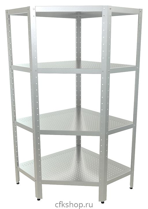 Угловой кухонный стеллаж Кобор СКПУ-3/5-100/80 предназначен для хранения посуды, различного инвентаря и сухих продуктов на предприятиях общественного питания и торговли. Модель оснащена перфорированными полками. Разборный каркас выполнен из уголка из оцинкованной стали, полки - из нержавеющей стали AISI 430.