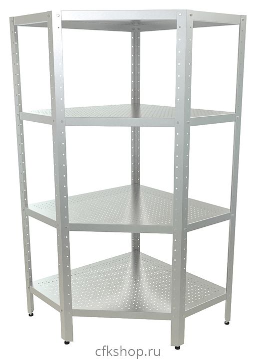 Угловой кухонный стеллаж Кобор СКПУ-4/3-90/100 предназначен для хранения посуды, различного инвентаря и сухих продуктов на предприятиях общественного питания и торговли. Модель оснащена перфорированными полками. Разборный каркас выполнен из уголка из оцинкованной стали, полки - из нержавеющей стали AISI 430.