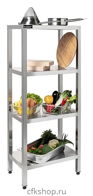 Стеллаж Кобор СКТ-80/40 предназначен для хранения посуды, кухонной утвари и сухих продуктов на предприятиях общественного питания, торговли и в промышленно-производственных помещениях. Каркас выполнен в виде уголка 40х40 мм из оцинкованной стали, полки - из нержавеющей стали AISI 430. Сварная конструкция обеспечивает жёсткость стеллажа.