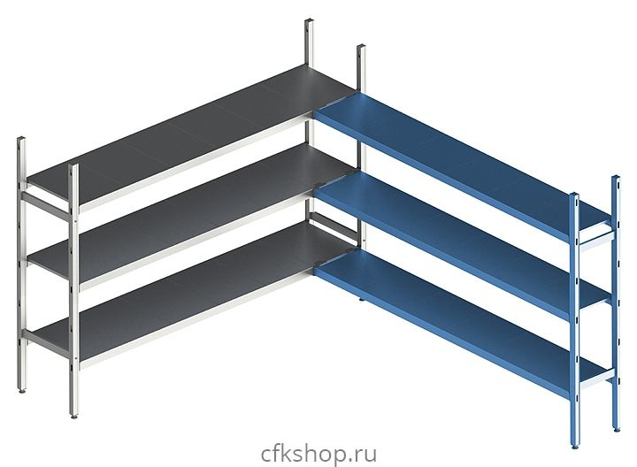 Модель представляет собой дополнительную угловую секцию модульной стеллажной системы и может стыковаться в линию с базовой и дополнительной линейной секциями.