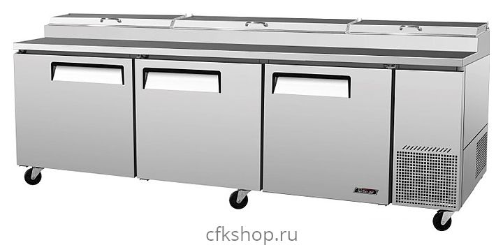 Стол для пиццы Turbo air CTPR-93 состоит из разделочной доски, на которой можно обрабатывать ингредиенты, и камеры, предназначенной для охлаждения и кратковременного хранения продуктов для приготовления пиццы на предприятиях пищевой промышленности, общественного питания и торговли. Модель оснащена 6 полками и 6 колесами фронтальными со стопорами. Корпус выполнен из нержавеющей стали (гальванизированная сталь на оборотной стороне и внизу) с применением пожаробезопасных стенок толщиной 60 мм, уплотнения - из АБС-пластика, который улучшает теплоизоляцию и не пропускает конденсат, пол - из нержавеющей стали с алюминиевыми вставками по бокам и сзади, двери собственной конструкции оснащены петлями из высококачественной нержавеющей стали, разделочная доска - из полиэтилена низкой плотности высокого давления.