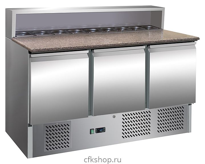 Стол для пиццы VIATTO PS903 SEC предназначен для охлаждения и кратковременного хранения продуктов, напитков и готовых блюд, а также для раскатки теста и обработки ингредиентов для приготовления пиццы на предприятиях общественного питания и торговли. Модель оснащена статической системой охлаждения и автоматической оттайкой. Корпус выполнен из нержавеющей стали, внутренняя камера - из алюминия, столешница - из гранита.