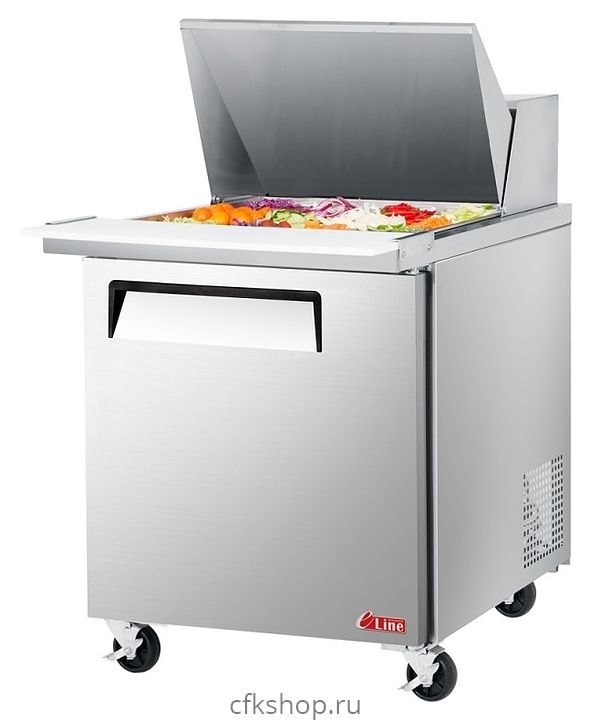 Холодильный стол Turbo air EST-28-12 серии E line используется на предприятиях общественного питания и торговли для кратковременного хранения предварительно охлажденных пищевых продуктов и приготовления из них сэндвичей. Модель оснащена встоенным холодильным агрегатом, холодильной камерой с распашной дверью и столешницей с боковыми фиксаторами для разделочной доски. Вертикально ориентированный корпус за исключением задней стенки, фронтальная облицовка двери, столешница и крышка выполнены из высококачественной нержавеющей стали SUS439 производства Posco, полка – из стального прутка с виниловым покрытием, разделочная доска – из термостойкого полиэтилена, термоизоляция – из пенополиуретана высокой плотности, испаритель с антикоррозийным покрытием.