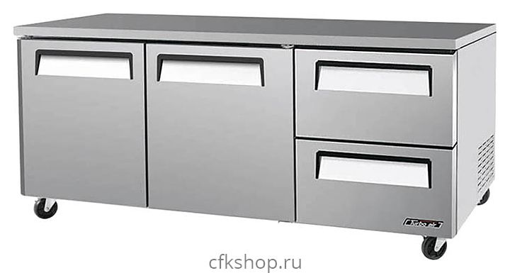 Холодильный стол Turbo air CMUR-72-2D-2 предназначен для раскатки теста, обработки, охлаждения и кратковременного хранения продуктов и напитков на предприятиях общественного питания и торговли. Корпус выполнен из нержавеющей стали (гальванизированная сталь на оборотной стороне и внизу) с применением пожаробезопасных стенок толщиной 60 мм, уплотнения - из АБС-пластика, пол - из нержавеющей стали с алюминиевыми вставками по бокам и сзади оборудования, регулируемые полки - из толстой стальной проволоки с виниловым покрытием, тройные направляющие - из высококачественной нержавеющей стали.
