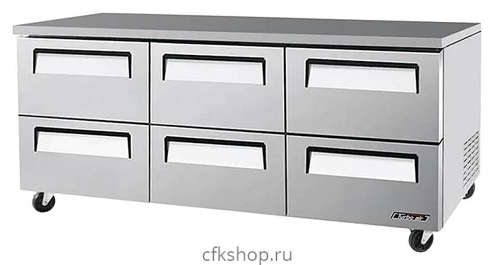 Холодильный стол Turbo air CMUR-72-2D-6 предназначен для раскатки теста, обработки, охлаждения и кратковременного хранения продуктов и напитков на предприятиях общественного питания и торговли. Корпус выполнен из нержавеющей стали (гальванизированная сталь на оборотной стороне и внизу) с применением пожаробезопасных стенок толщиной 60 мм, уплотнения - из АБС-пластика, пол - из нержавеющей стали с алюминиевыми вставками по бокам и сзади оборудования, регулируемые полки - из толстой стальной проволоки с виниловым покрытием, тройные направляющие - из высококачественной нержавеющей стали.