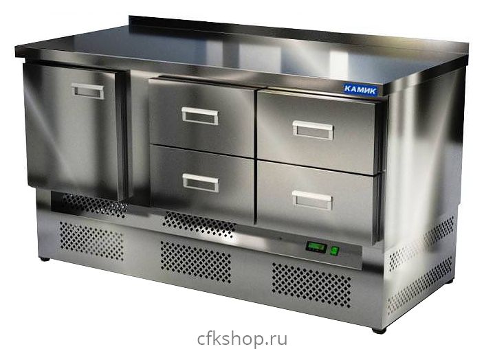 Холодильный стол КАМИК СОБН-14156 используется на предприятиях общественного питания и торговли для охлаждения и хранения продуктов, напитков и готовых блюд. Конструкция разделена на секции, секция с дверью оборудована сетчатой полкой и парой направляющих. Корпус выполнен из нержавеющей стали AISI 430.