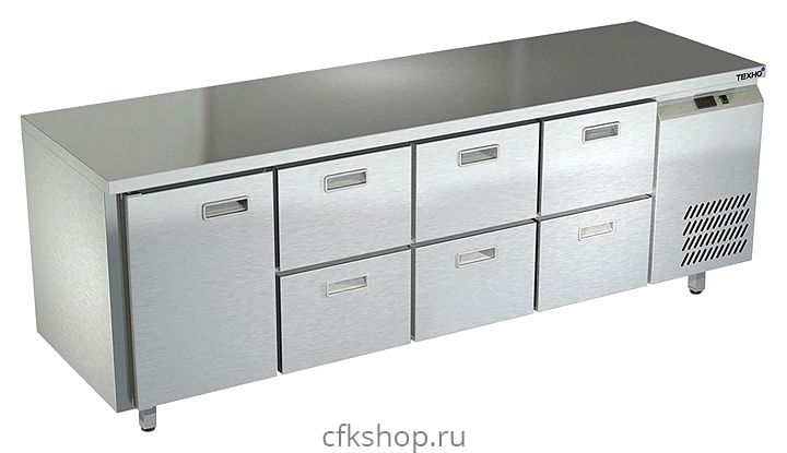 Холодильный стол Техно-ТТ СПБ/О-122/16-2207 предназначен для раскатки теста, обработки, охлаждения и кратковременного хранения продуктов и напитков на предприятиях общественного питания и торговли. Модель оснащена секцией с дверью, 3 секциями с 6 ящиками, направляющими с доводчиками (Австрия), петлями-доводчиками (Польша) и круглыми ножками, регулируемыми по высоте на 50 мм (Италия). Корпус выполнен из нержавеющей стали AISI 430, задняя стенка и дно - из оцинкованной стали.