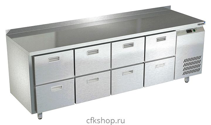 Холодильный стол Техно-ТТ СПБ/О-223/08-2207 предназначен для раскатки теста, обработки, охлаждения и кратковременного хранения продуктов и напитков на предприятиях общественного питания и торговли. Модель оснащена 4 секциями с 8 ящиками, направляющими с доводчиками (Австрия) и круглыми ножками, регулируемыми по высоте на 50 мм (Италия). Корпус выполнен из нержавеющей стали AISI 430, задняя стенка и дно - из оцинкованной стали.