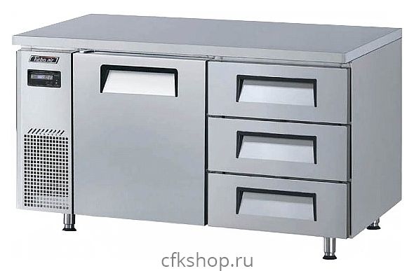 Морозильный стол Turbo air KUF15-3D-3-750 предназначен для обработки, охлаждения, заморозки и длительного хранения пищевых продуктов на предприятиях общественного питания и торговли. Модель оснащена дверью, полкой, 3 ящиками, эргономичными ручками и 4 регулируемыми ножками. Корпус выполнен из нержавеющей стали (гальванизированная сталь на оборотной стороне и внизу), пол - из нержавеющей стали с алюминиевыми вставками по бокам и сзади, тройные направляющие ящиков и ножки - из нержавеющей стали, уплотнение - из ABS-пластика.