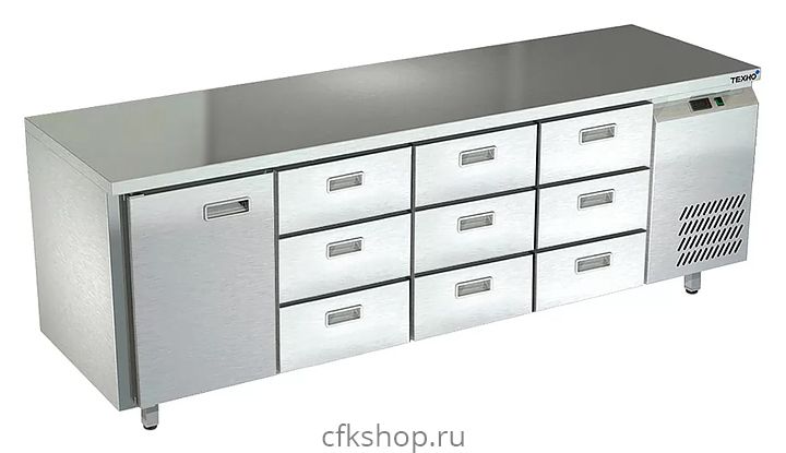 Морозильный стол Техно-ТТ СПБ/М-122/19-2206 предназначен для раскатки теста, обработки, заморозки и долговременного хранения продуктов, полуфабрикатов, напитков и мороженого на предприятиях общественного питания и торговли. Модель оснащена 1 секцией с дверью и регулируемой полкой-решеткой, 3 секциями с 9 ящиками, направляющими с доводчиками (Австрия), петлями-доводчиками (Польша) и круглыми ножками, регулируемыми по высоте на 50 мм (Италия). Корпус и столешница выполнены из нержавеющей стали AISI 430, задняя стенка и дно - из оцинкованной стали.