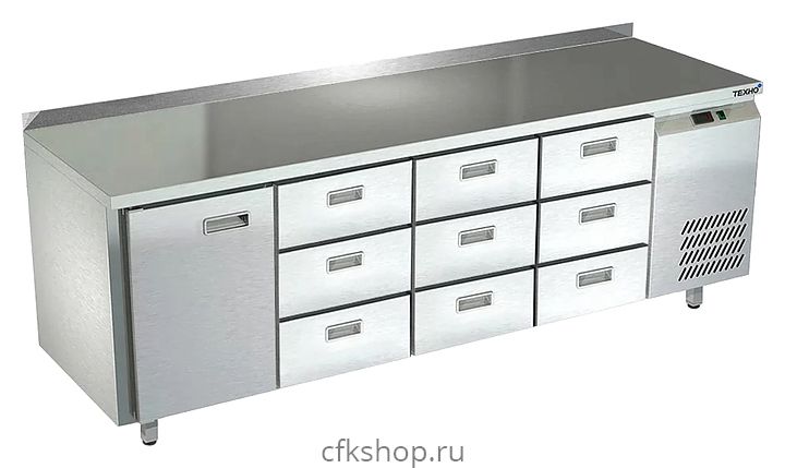 Морозильный стол Техно-ТТ СПБ/М-222/19-2207 предназначен для раскатки теста, обработки, заморозки и долговременного хранения продуктов, полуфабрикатов, напитков и мороженого на предприятиях общественного питания и торговли. Модель оснащена 1 секцией с дверью и регулируемой полкой-решеткой, 3 секциями с 9 ящиками, направляющими с доводчиками (Австрия), петлями-доводчиками (Польша), бортом и круглыми ножками, регулируемыми по высоте на 50 мм (Италия). Корпус и столешница выполнены из нержавеющей стали AISI 430, задняя стенка и дно - из оцинкованной стали.
