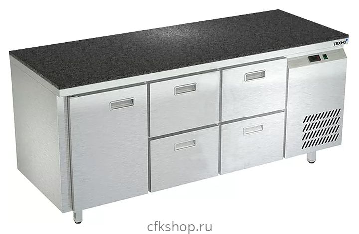 Морозильный стол Техно-ТТ СПБ/М-322/14-1806 предназначен для раскатки теста, обработки, заморозки и долговременного хранения продуктов, полуфабрикатов, напитков и мороженого на предприятиях общественного питания и торговли. Модель оснащена 1 секцией с дверью и регулируемой полкой-решеткой, 2 секциями с 4 ящиками, направляющими с доводчиками (Австрия), петлями-доводчиками (Польша) и круглыми ножками, регулируемыми по высоте на 50 мм (Италия). Корпус выполнен из нержавеющей стали AISI 430, задняя стенка и дно - из оцинкованной стали, столешница - из камня.