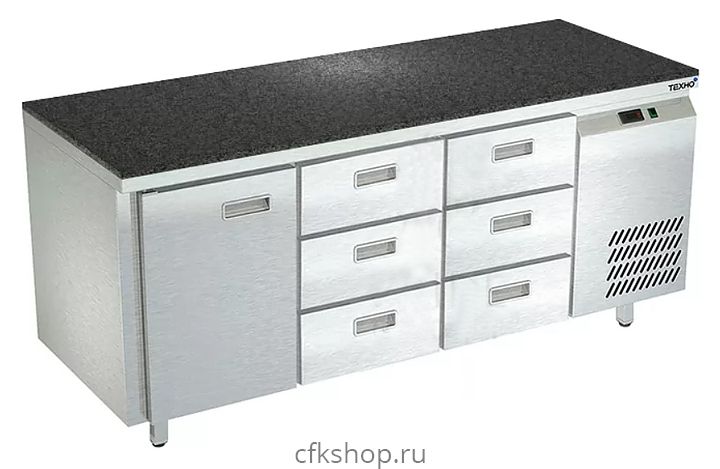 Морозильный стол Техно-ТТ СПБ/М-322/16-1806 предназначен для раскатки теста, обработки, заморозки и долговременного хранения продуктов, полуфабрикатов, напитков и мороженого на предприятиях общественного питания и торговли. Модель оснащена 1 секцией с дверью и регулируемой полкой-решеткой, 2 секциями с 6 ящиками, направляющими с доводчиками (Австрия), петлями-доводчиками (Польша) и круглыми ножками, регулируемыми по высоте на 50 мм (Италия). Корпус выполнен из нержавеющей стали AISI 430, задняя стенка и дно - из оцинкованной стали, столешница - из камня.