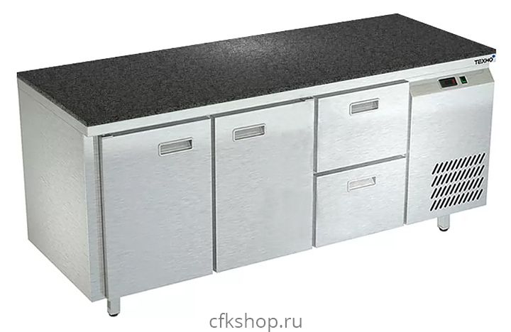 Морозильный стол Техно-ТТ СПБ/М-322/22-1806 предназначен для раскатки теста, обработки, заморозки и долговременного хранения продуктов, полуфабрикатов, напитков и мороженого на предприятиях общественного питания и торговли. Модель оснащена 2 секциями с 2 дверьми и регулируемой полкой-решеткой, 1 секцией с 2 ящиками, направляющими с доводчиками (Австрия), петлями-доводчиками (Польша) и круглыми ножками, регулируемыми по высоте на 50 мм (Италия). Корпус выполнен из нержавеющей стали AISI 430, задняя стенка и дно - из оцинкованной стали, столешница - из камня.