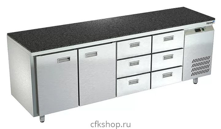 Морозильный стол Техно-ТТ СПБ/М-322/26-2206 предназначен для раскатки теста, обработки, заморозки и долговременного хранения продуктов, полуфабрикатов, напитков и мороженого на предприятиях общественного питания и торговли. Модель оснащена 2 секциями с 2 дверьми и регулируемой полкой-решеткой, 2 секциями с 6 ящиками, направляющими с доводчиками (Австрия), петлями-доводчиками (Польша) и круглыми ножками, регулируемыми по высоте на 50 мм (Италия). Корпус выполнен из нержавеющей стали AISI 430, задняя стенка и дно - из оцинкованной стали, столешница - из камня.